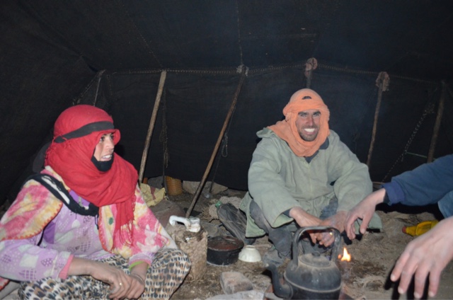 It was at this point that Aziz the Berber Nomad who spoke no English, French or Arabic invited us to stay in his tent for the night. His wife Miriam came down to welcome us and she wrapped her cloak around Lynn.