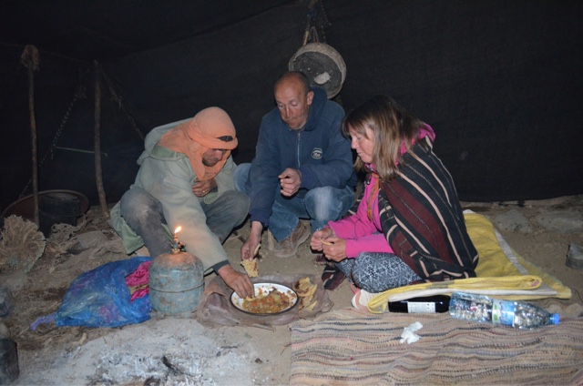 We settled around the fire in the tent and Miriam first made tea. They then insisted that we share their meal, it was a lamb stew eaten from one plate using bread.